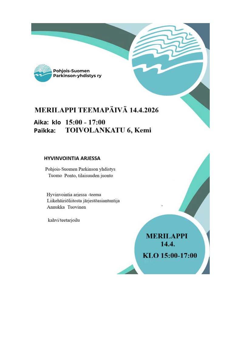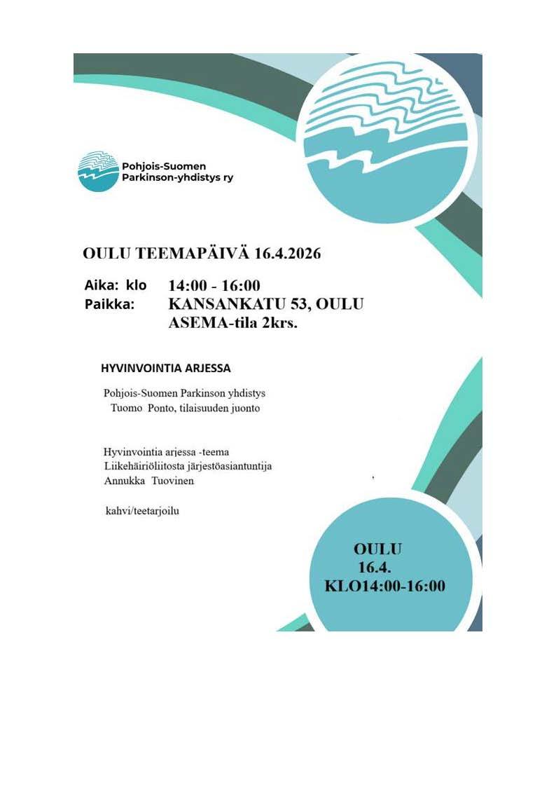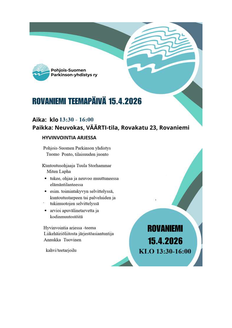 Pohjois-Suomen Parkinson-yhdistys järjestää 14.-16. huhtikuuta kolme Hyvinvointia arkeen -teemapäivää Meri-Lapissa, Rovaniemellä ja Oulussa. Tilaisuuksissa kuullaan ajankohtaista tietoa arjen hyvinvointia tukevista palveluista sekä tavataan muita Parkinsonin tautia sairastavia ja heidän läheisiään.